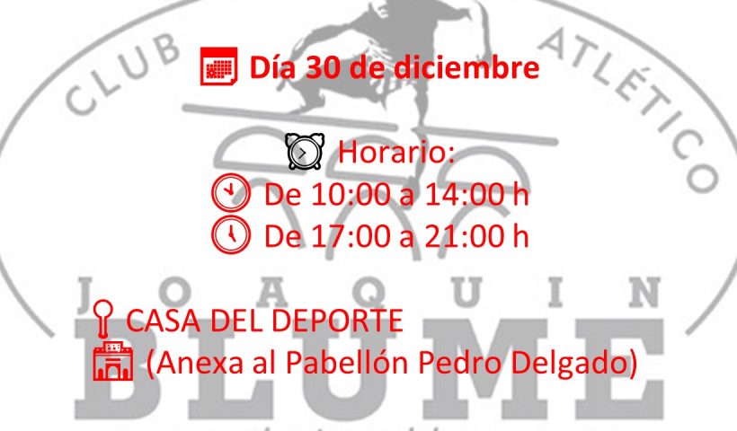 🎽🏃♂️ Estos serán los horarios de recogida de dorsalesy de inscripción presencial del📅 30 de diciembre 📍 Lugar:🏟️ Sala 2 – Pabellón Pedro Delgado ⏰…